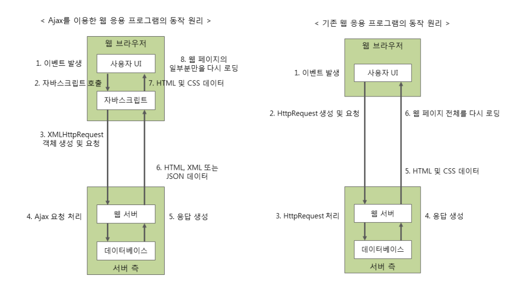 즉 Ajax를 이용하면 백그라운드 영역에서 서버와 통신하여, 그 결과를 웹 페이지의 일부분에만 표시할 수 있는 비동기식으로 요청하는 것입니다.