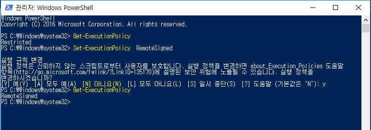 2. Set-ExecutionPolicy 명령어로 나의 권한을 RemoteSigned로 바꾸기