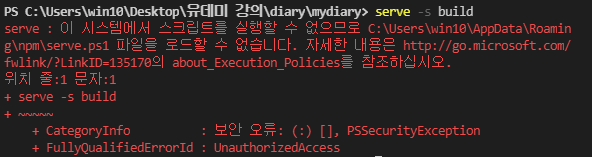 serve : 이 시스템에서 스크립트를 실행할 수 없으므로 C:\Users\win10\AppData\Roamin