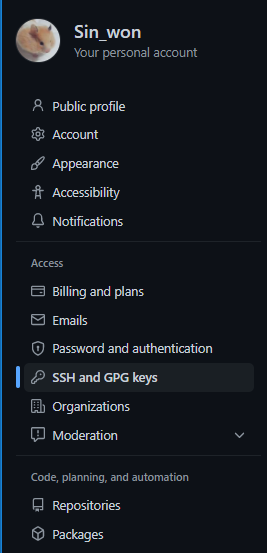 🔊 6. Github settings페이지로 이동 & SSH and GPG keys 이동