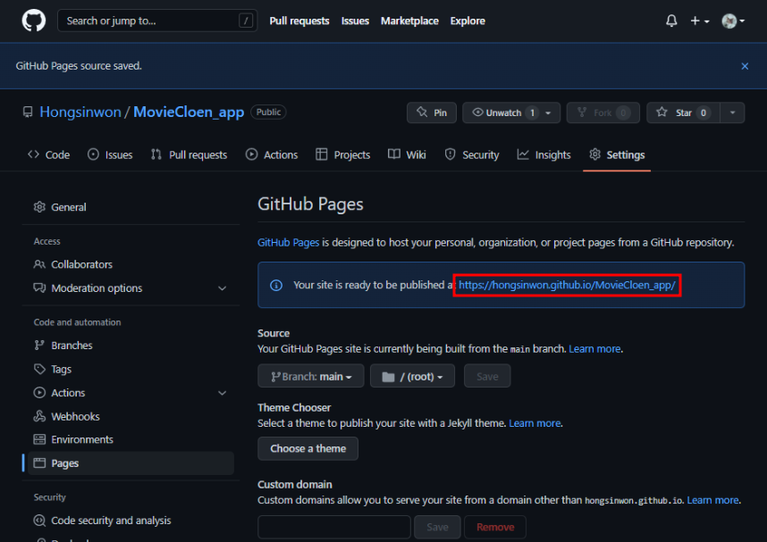 브랜치를 gh-pages 로 설정하고 저장해줘야 한다.