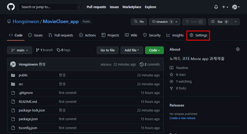 커밋한 Github 저장소의 페이지에 진입한 후에 상단에 있는 [Settings]을 클릭해줍니다.